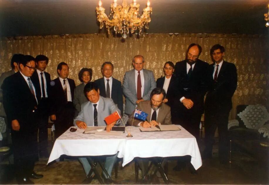 ▲ 1984年,张勇先(后排左三)在中澳教育交流协议签署现场。