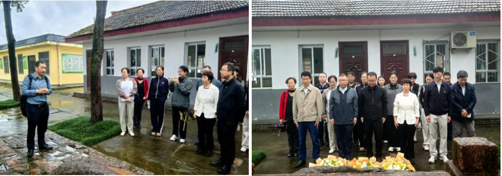 随后,队伍前往国立西北医学院旧址——文家庙小学。这所承载着特殊历史记忆的校园,既是当地基础教育的重要阵地,更是抗战时期医学教育救亡图存的见证者。现场,西安交大二附院教工、西北联大联盟副秘书长杨龙以详实史料为引,生动再现了该校作为国立西北医学院办学点的历史沿革,以及先辈们在此开展医疗教学、支援抗战前线的动人篇章。在校园内的医学教育抗战纪念碑前,全体人员肃立献花,缅怀为抗战医疗事业奉献的先驱,让家国情怀与职业担当在静默中薪火相传。