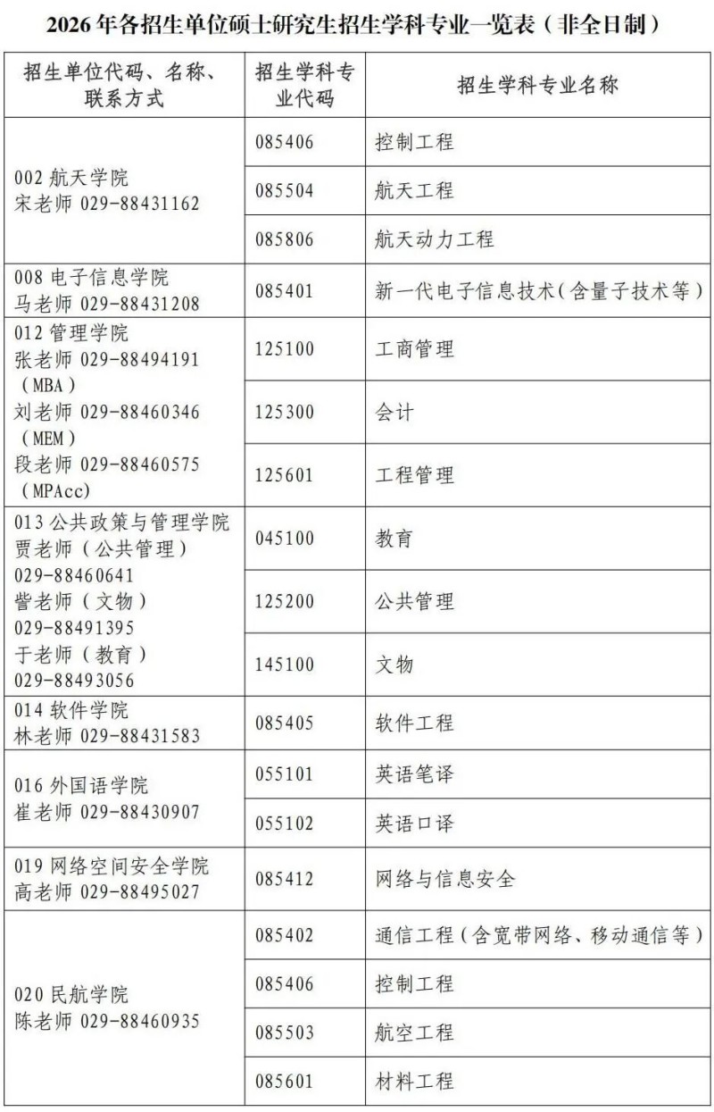 凡报考西北工业大学非全日制研究生的考生,请在报考前查询硕士招生目录并与报考学院联系,了解报考资格、修业年限、收费标准等内容。原则上非全日制硕士研究生招收在职定向就业人员。