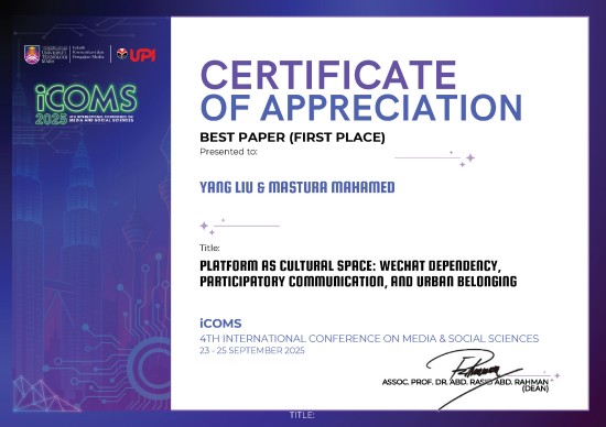 西安欧亚学院文化传媒学院网络与新媒体专业专职教师、马来西亚博特拉大学现代语与传播学院在读博士刘阳参加大会分论坛演讲,并凭借研究主题Platform as Cultural Space:WeChat Dependency, Participatory Communication,and Urban Belonging荣获大会全场论文一等奖(Best Paper Award)。