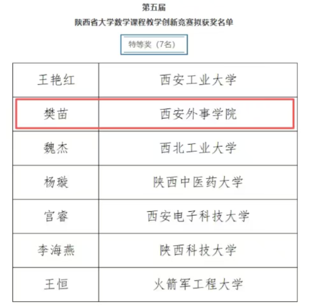 近日,由陕西省教科文卫体工会委员会与陕西省数学会联合主办的第五届陕西省大学数学课程教学创新竞赛获奖结果正式公示。西安外事学院共有8位教师参与比赛,其中商学院樊苗荣获特等奖,商学院田启燕、工学院苗壮荣获三等奖。
