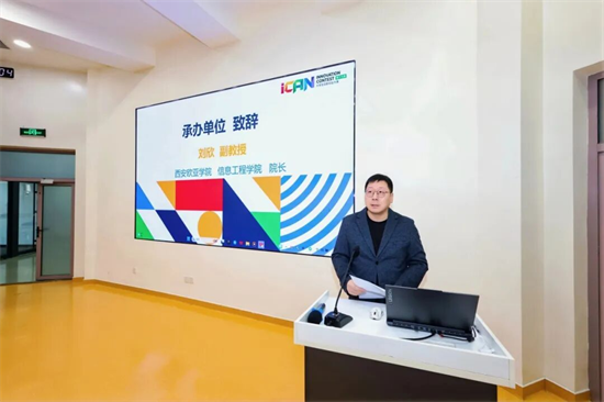 西安欧亚学院信息工程学院院长刘欣副教授代表承办单位致辞。他指出,iCAN 大赛自创办以来,始终以“自信、坚持、梦想”为内核,已成长为全国高校最具影响力的创新创业赛事;此次落地欧亚,既是荣耀,更是责任。随后,他向所有参赛团队送上祝福。