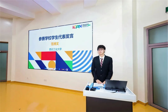 iCAN大赛西北赛区负责人、西北工业大学机电学院教授何洋介绍了西北赛区的赛事情况,并对iCAN大赛鼓励原始创新、培养创新人才的竞赛精神进行了深刻解读;西北工业大学学生范博文代表全体参赛选手发言。他让大家跟随一条“仿生鱼”潜入创新深海:凌晨四点的键盘声、零件散落的实验桌、赛程焦灼的对接现场……他用亲身经历讲述如何把“自信、坚持、梦想”六个字一点点敲进骨血,让在场师生听见青春与创意同频的心跳。