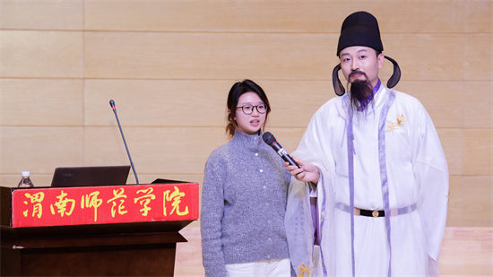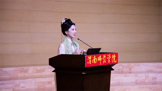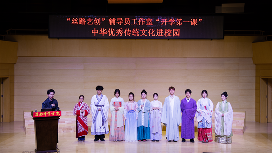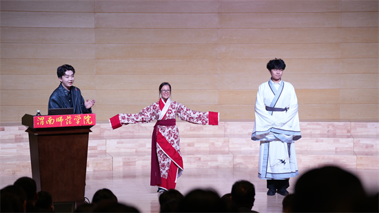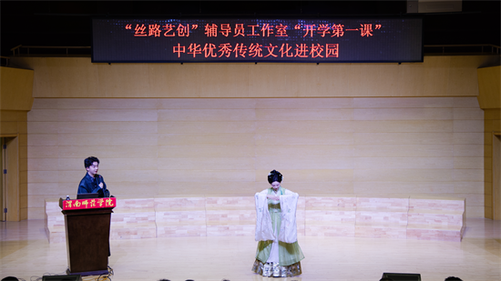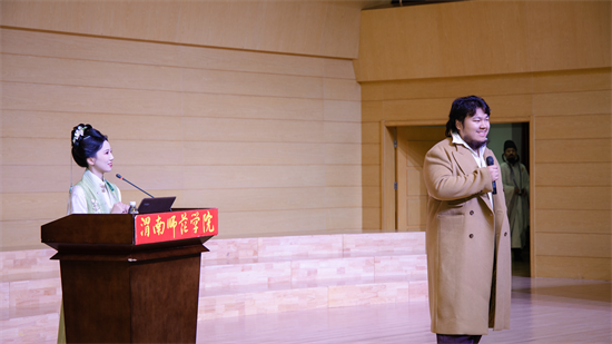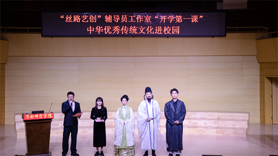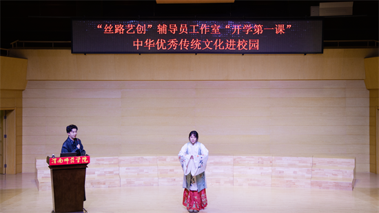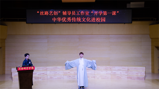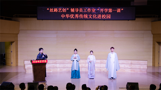10月30日晚,渭南师范学院莫斯科艺术学院“丝路艺创”辅导员工作室开学第一课——“中华优秀传统文化进校园”活动在逸夫楼音乐厅精彩开讲。特邀优秀校友国风达人“皮卡晨”冯佳晨、李白扮演者高鑫、子虞三位嘉宾齐聚一堂,以沉浸式、互动式的体验,为现场师生奉上了一场传统文化盛宴。