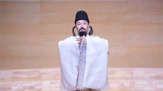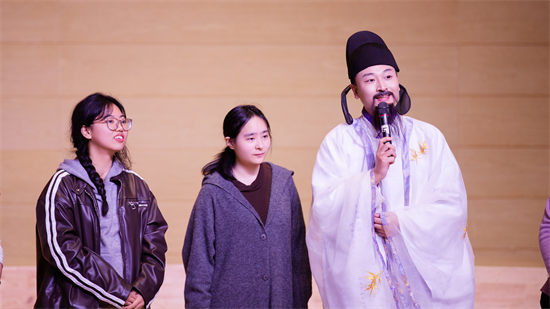 高鑫——宛如诗仙“下凡”对诗,盛唐气象尽现眼前。扮演李白的高鑫以“诗仙”风范惊喜亮相,带来“诗仙的精神世界与文化传承”主题开场,瞬间点燃了现场氛围。他采用互动问答的方式,与观众一同领略李白诗词的豪放浪漫。 “‘举杯邀明月,对影成三人’的孤独与豁达,‘天生我材必有用,千金散尽还复来’的自信与洒脱……”高鑫在对诗互动中,将李白的人生态度与盛唐文化的精神特质传递给在场师生。他还结合当代短视频、文创设计等新载体,分享如何让古典诗词在年轻群体中“破圈”传播。