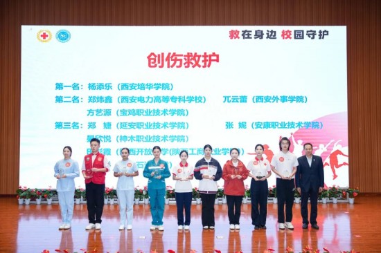 本次展示活动创新采用“专题培训+技能展示+主题演讲”三维模式,设置实操竞技、情景模拟等多维度考核环节,全方位考核参赛队伍的理论功底和协同能力。经过激烈角逐,分别评选出心肺复苏+AED单项奖一、二、三等奖;创伤救护单项奖一、二、三等奖;主题演讲单项奖一、二、三等奖;团体一、二、三等奖及优秀组织奖。其中,西安培华学院代表队获团体二等奖及优秀组织单位称号。医学院杨添乐同学摘得创伤救护组一等奖,张璐同学在成人心肺复苏(CPR+AED)项目获三等奖,杜元元同学获主题演讲三等奖。