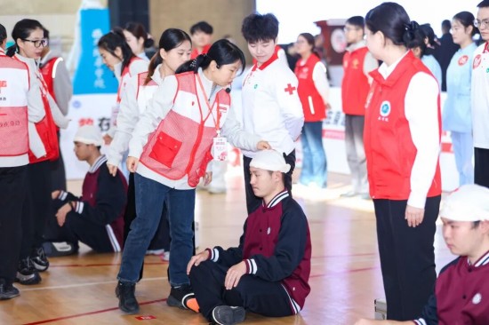 初赛环节,60支队伍分4组同步展示“成人心肺复苏(CPR+AED)”“头顶部右侧出血包扎”“右小腿骨折固定”“右踝关节扭伤处理”4个科目操作,经激烈比拼,16支队伍晋级下午择优展示环节。