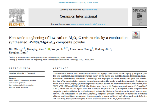 在深耕材料科学领域五年的时间中,她的成果不断获得行业认可。让郑欣倍感温暖与鼓舞的是,加入培华后,学校对科研工作给予了全力支持,为她搭建了施展专业才华的广阔舞台。今年带领团队在国际材料领域SCIE期刊《Ceramics International》发表题为《Nanoscale toughening of low-carbon Al₂O₃-C refractories by a combustion synthesized BNNSs/MgAl₂O₄ composite powder》的学术论文。这一期刊创刊于1971年,由Elsevier Ltd出版,在中国科学院分区中属材料科学大类2区,为材料科学权威Top期刊,影响因子5.6,是国际公认的材料科学权威刊物之一。