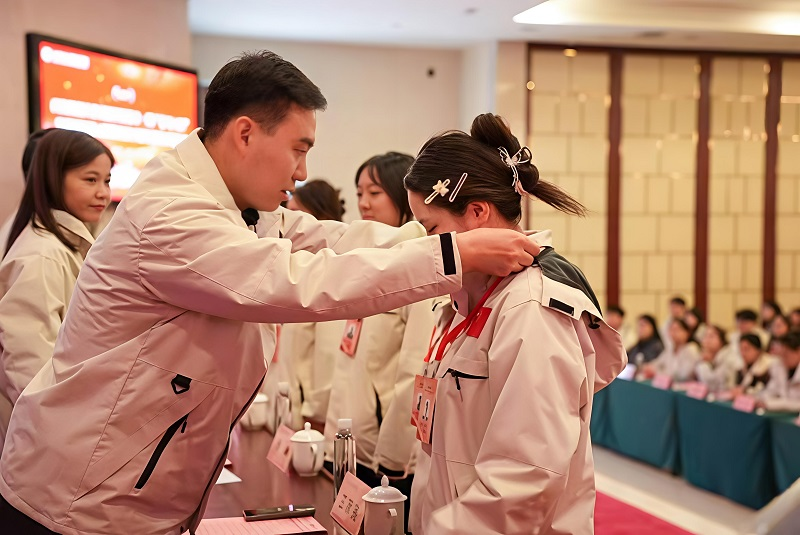 学院团委书记滕婵娟为十一期“青马工程”学员代表颁发学员证。青年代表手中的,不仅仅是学员证,更是“勤学善思、知行合一”的学风要求具象化传递。“从老师手中接过的不仅是学员证,更是一份沉甸甸的责任。”学生代表道出了在场学员的心声。最后,全体学员的庄严宣誓,声声誓言在会场回荡。这既是对革命先辈的承诺,更是对学校立德树人根本任务的生动回应。