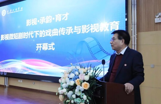 西安工商学院校长廖民生在开幕式上致辞。他指出,当前文化强国战略推进,数字技术发展催生影视微短剧新兴视听形态,传统戏曲亦在守正创新中焕发新生。西安工商学院始终坚定走地方性、应用型、特色化的发展道路,扎根三秦沃土,服务西部发展。艺术与传媒学院积极探索“艺工融通、一专多能”育人途径,以地方文化为根基,打造从内容策划到传播推广的一体化创作链条,培育市场急需紧缺的应用型传媒人才。期待通过本次学术论坛、深入讨论影视微短剧的陕西路径、戏剧当代表达及应用型艺术人才培养的创新模式,为文化强国建设与区域文化产业高质量发展贡献智慧与方案。
