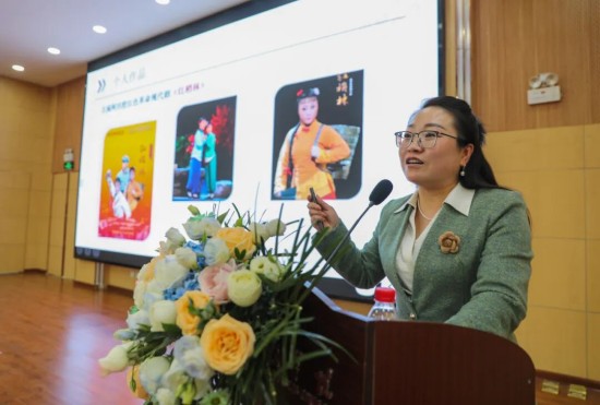 国家二级演员、富平县阿宫剧团副团长李曼以《阿宫腔戏曲艺术与当代传承》为题,系统阐释了阿宫腔这一古老剧种的独特魅力与当代传承实践。李老师与剧团青年演员联袂为现场师生演绎了阿宫腔片段。他们精湛的舞台风范生动诠释了阿宫腔婉转的唱腔与追求极致的表演,将会议现场推向高潮。表演以翻高遏低的“阿宫(遏工)”唱腔为核心,呈现了兼具柔腻委婉与刚劲激昂的艺术特色。李曼阐释了“阿宫”之妙、“影戏”之韵与“精细”之美三大核心美学。在当代传承方面,李曼着重介绍了以富平县阿宫剧团为基地的实践成果,通过“潜心育人,薪火相传”培养了大批小演员,并积极“深耕校园,播种未来”以拓展受众。报告呈现了阿宫腔作为非物质文化遗产在当代得以活化传承并焕发新生机的经验,为传统戏曲的现代化转型提供了宝贵经验。