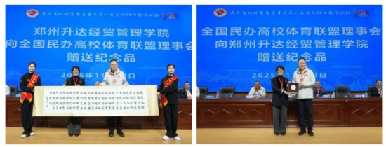 仪式现场,郑州升达经贸管理学院校长张欣与全国民办高校体育联盟理事长姜波博士互赠纪念品。这份互赠不仅承载着升达学院对联盟的诚挚谢意,更凝聚了双方深化合作、共促民办高校体育教育发展的美好愿景。
