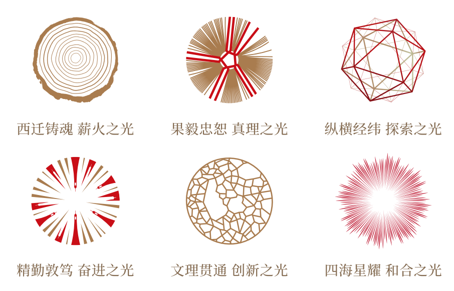 其中“光”一字,结合学校的历史文化和职能定位,涵喻“西迁铸魂薪火之光、果毅忠恕真理之光、纵横经纬探索之光、精勤敦笃奋进之光、文理贯通创新之光、四海星耀和合之光”六个维度的含义,以示学校130年来在人才培养、科学研究、社会服务等领域的辉煌成就,更指西迁70年来,学校扎根西部,传承弘扬西迁精神,产教融合汇聚创新资源,在打造服务新时代西部大开发形成新格局的创新引擎、支撑区域经济社会发展中绽放的独特光芒,呼应了交大“为世界之光”的美好愿景。