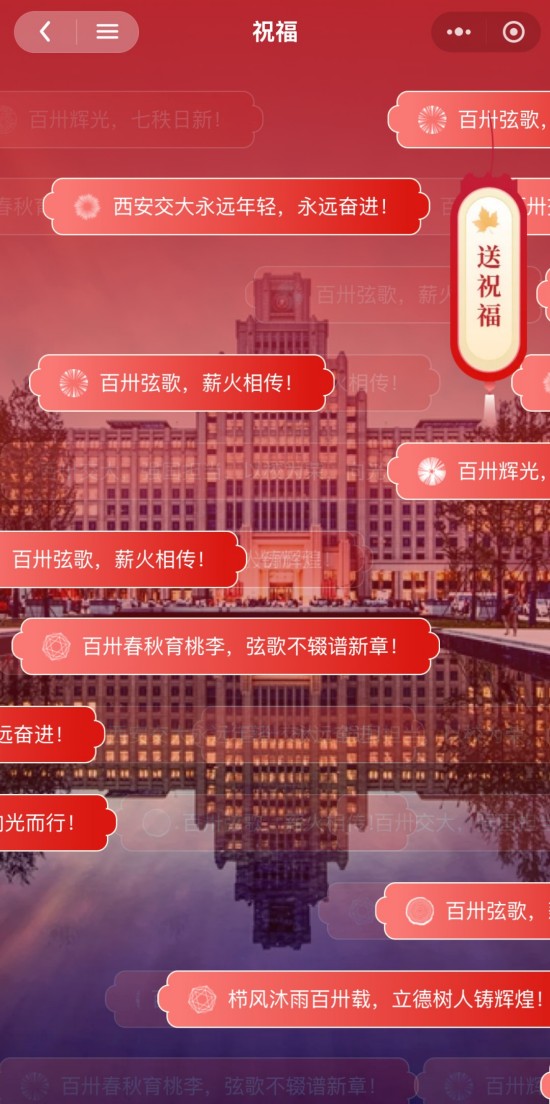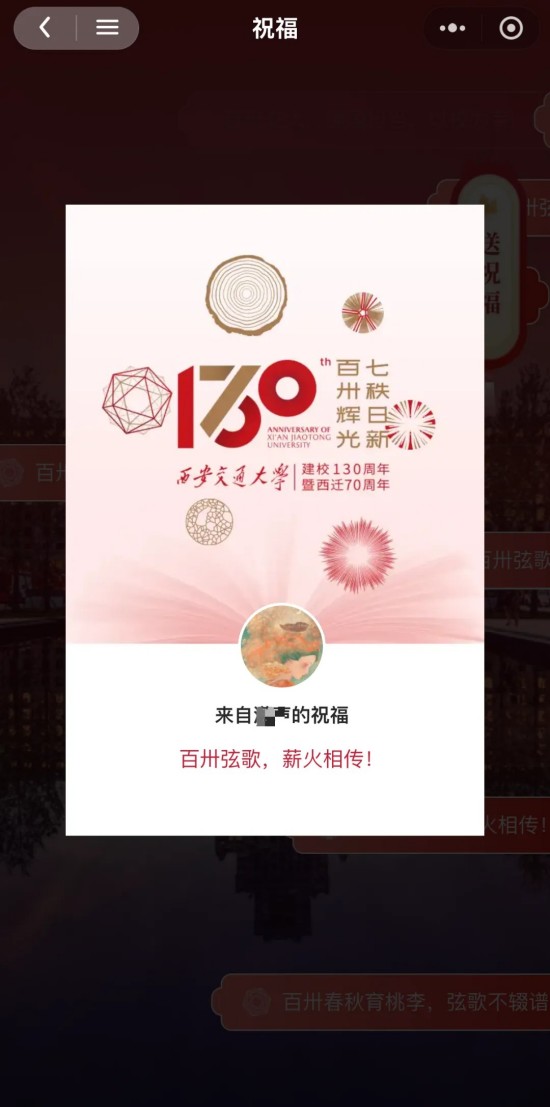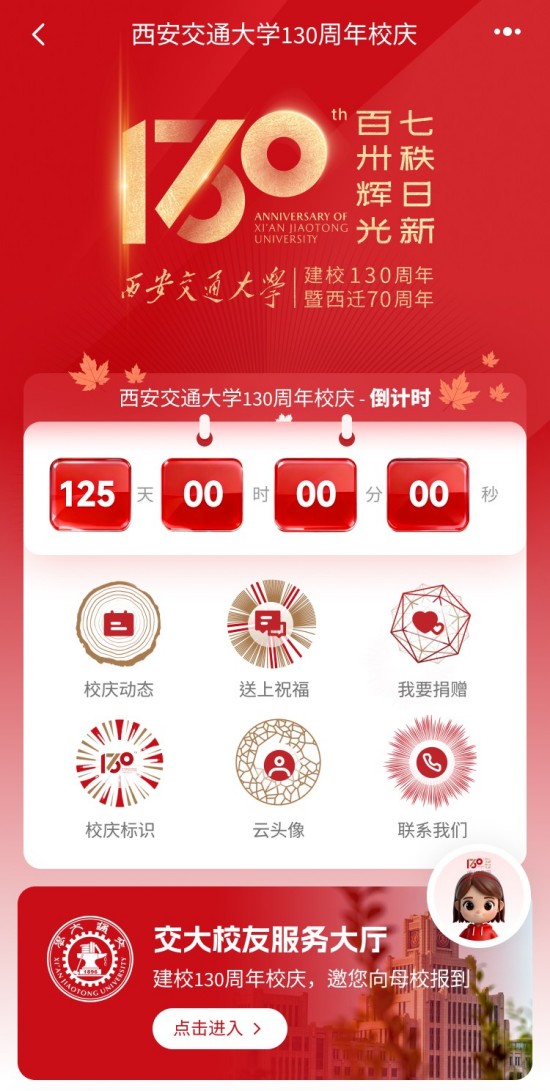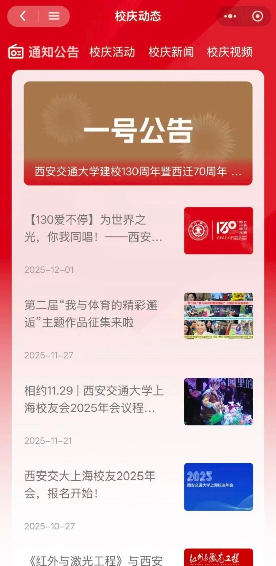 “西安交通大学130周年校庆”小程序正式上线,用于发布校庆通知公告、展示系列庆祝活动、汇聚祝福捐赠、提供校庆服务等。