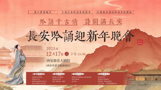 2025年12月17日15:00,“吟诵千古情、诗韵满长安”——长安吟诵迎新年晚会,将在西安鼓乐大剧院(西安外事学院南校区)隆重上演!