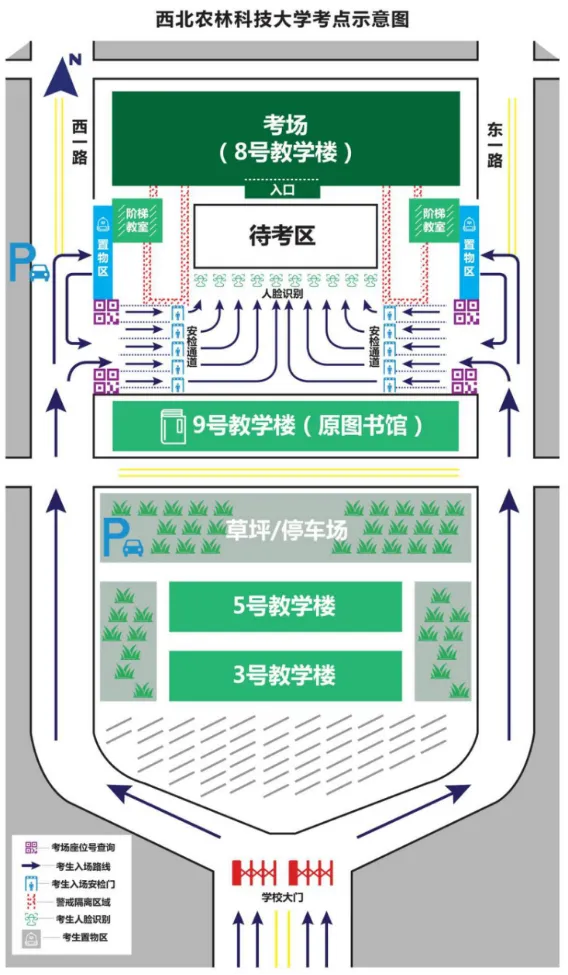 西北农林科技大学考场设置在北校区8号教学楼,具体考场号见准考证。校外考生凭身份证、准考证(缺一不可)进入校园,12月19日(星期五)14:00-17:00,考生可进入校园了解考场位置及考点有关注意事项,以下为西北农林科技大学考点示意图。