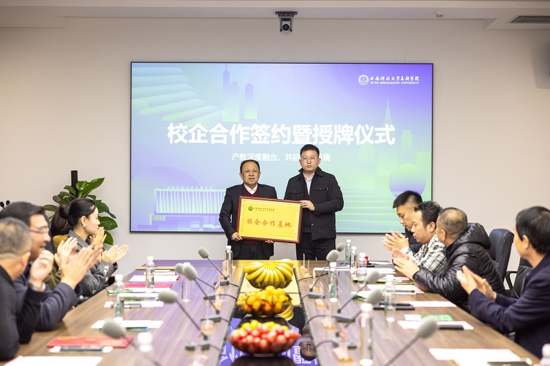 仪式核心环节,西安科技大学高新学院与西安市商业企业协会率先签署战略合作框架协议,并举行“校企合作基地”授牌仪式,同时西安科技大学高新学院被授予西安商业企业协会常务副会长单位。标志着双方将在人才培养、实习就业、项目研发等领域开展长期深度合作。随后,学院及二级学院分别与西安冰峰饮料、西安众天蜂业、西安市商标事务所、西安广播电视台交通旅游广播、西安蜂窝文化传媒、西安三优眼视光等6家企业签署合作协议并授牌。其中,经济管理与传媒艺术学院将重点对接企业电商运营、品牌传播需求,科技与工程学院将聚焦智能制造、数字化人才培养,共同打造“定制培养、实习就业、项目合作”一体化的校企合作新模式。