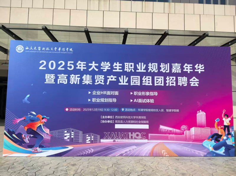 2025年12月19日,2025年大学生职业规划嘉年华暨高新集贤产业园组团招聘会在西安建筑科技大学华清学院楼观校区顺利举办并圆满落幕。本次活动作为第三届全国大学生职业规划大赛校赛的重要组成部分,旨在为学生搭建与企业HR直接对话、投递简历、现场面试的一站式求职平台,助力学生明晰职业方向、提升就业竞争力。就业桥为本次招聘会提供了全方位、智能化的设备支持,为参会学生带来沉浸式、个性化、高效率的求职体验。