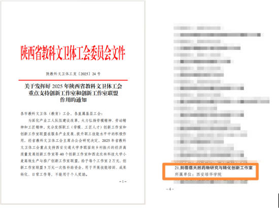 近日,陕西省教科文卫体工会印发了《关于发挥好2025年陕西省教科文卫体工会重点支持创新工作室和创新工作室联盟作用的通知》(陕教科文卫体工发〔2025〕24号),校工会推荐的“别蓓蓓天然药物研究与转化创新工作室”成功获批陕西省教科文卫体工会重点支持创新工作室。这一荣誉不仅是对工作室在天然药物研究领域创新实力与发展潜力的权威认可,更为学校科研创新体系完善、产教深度融合推进注入新动能。