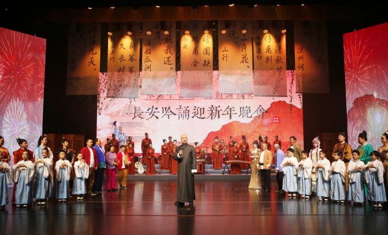 “长安吟诵”是西安外事学院理事长、校长黄藤团队基于深厚的地方文化根脉,系统发掘构建的古典诗词音声艺术体系。该体系以世界非物质文化遗产“西安鼓乐”中的赞、歌章及流传至今的古诗词曲谱为核心载体,融入了秦腔等地方曲艺调式,包含了吟诵、吟唱等非遗形式,是一套地方底蕴突出、音乐特征鲜明、理论体系完整的艺术形态。