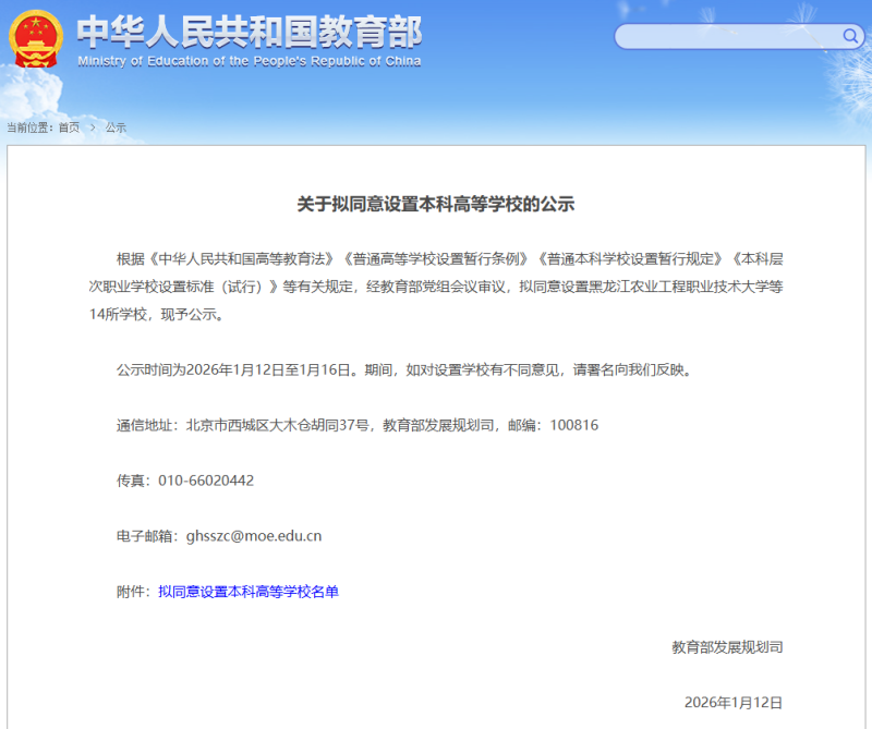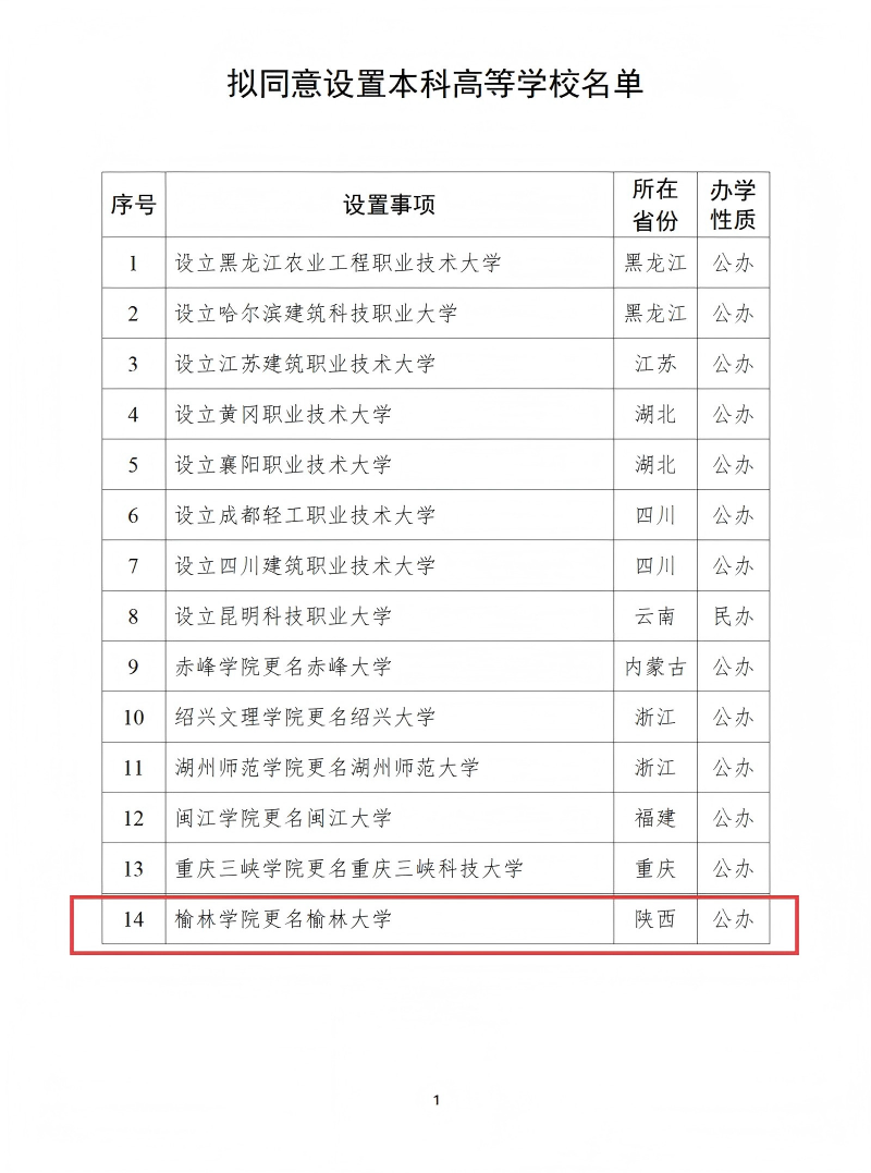 2026年1月12日,教育部发展规划司发布《关于拟同意设置本科高等学校的公示》,榆林学院更名为榆林大学的申请已获列入公示名单,公示期为1月12日至16日。此举标志着这所具有百年办学历史、扎根陕甘宁蒙晋交界区域的高等院校,即将实现办学层次的重大提升,迈入高质量发展的新阶段。
