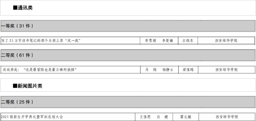 经评选委员会严格筛选与评定,众多优秀作品在激烈竞争中崭露头角。《写了23万字读书笔记的那个女孩上岸“双一流”》荣获通讯类一等奖,该作品通过细腻的叙事与生动的细节刻画,展现了当代青年在学术追求中的坚韧与智慧,作品兼具时代价值与人文温度。《双向奔赴:“这是最冒险也是最正确的抉择”》荣获通讯类二等奖,该作品通过细腻刻画个体在理想与现实、自我与他人之间的抉择与成长,展现了当代青年在时代浪潮中突破自我、追寻价值的勇气。《2025级新生开学典礼暨军训总结大会》荣获新闻图片类二等奖,作品通过精心选取的视觉元素与巧妙的构图设计,生动记录了新生从“初入校园”到“蜕变成长”的关键节点,既展现了青春风采,又传递了时代精神。