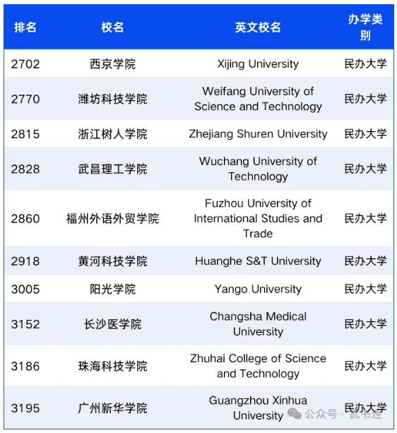 以下10所民办大学进入武书连世界大学综合实力排名榜单。以下5所独立学院进入武书连世界大学综合实力排名榜单。