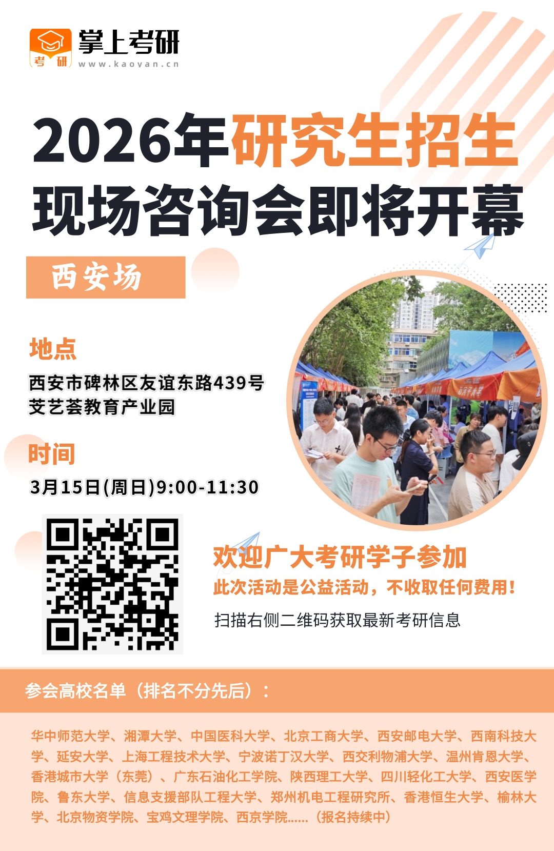 为助力广大考研学子精准把握全国研招院校最新报考动态,高效规划备考与报考方向,掌上考研特举办2026全国研究生招生现场咨询会(西安场)。本次活动搭建权威沟通桥梁,让考生与各高校研招办老师面对面交流,扫清备考报考障碍,欢迎各位考研学子踊跃到场咨询!