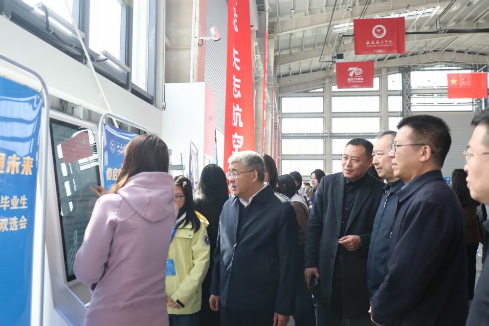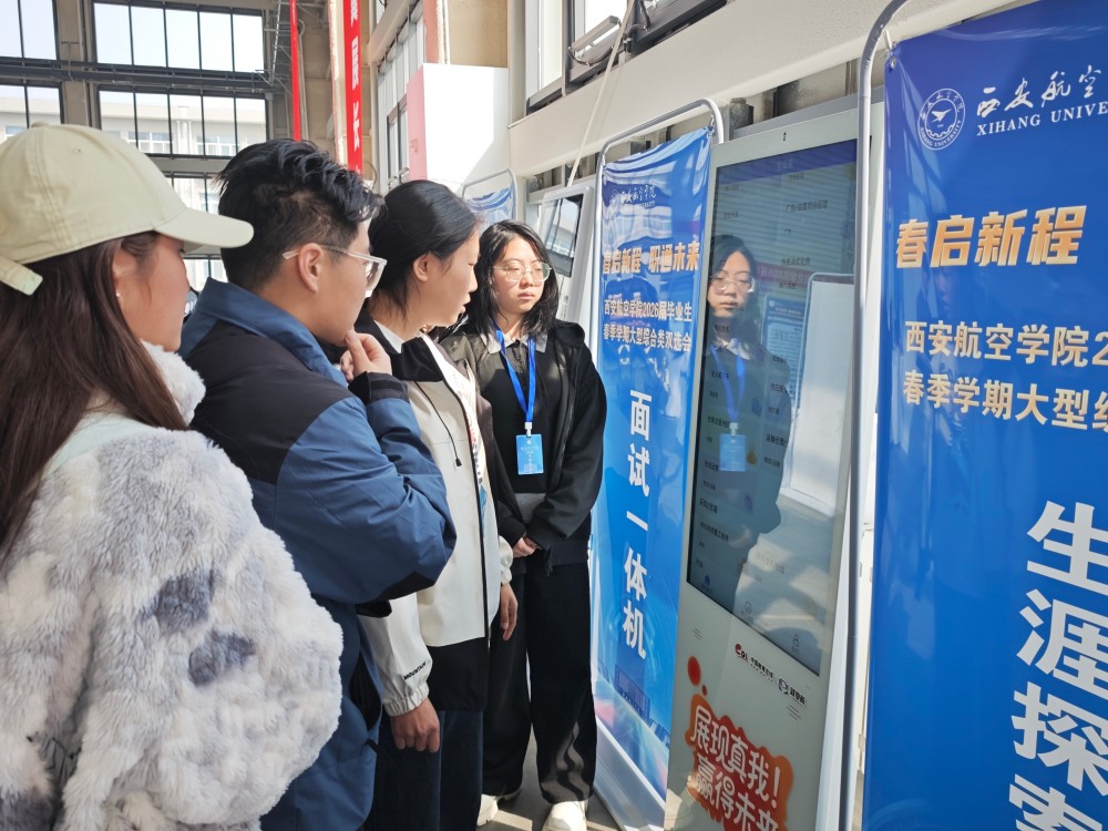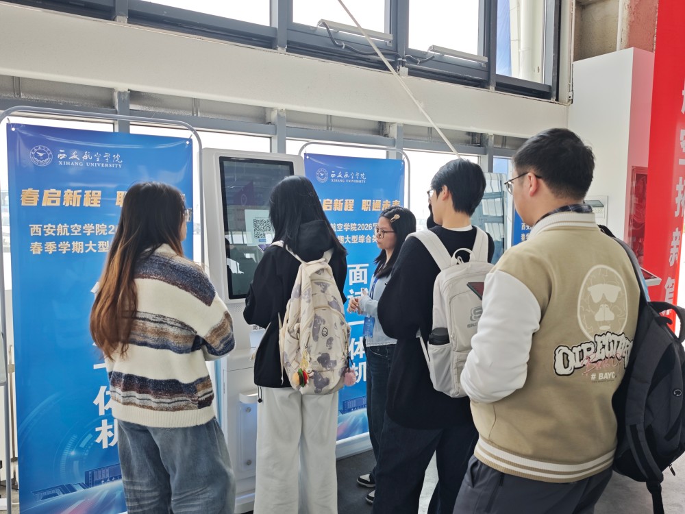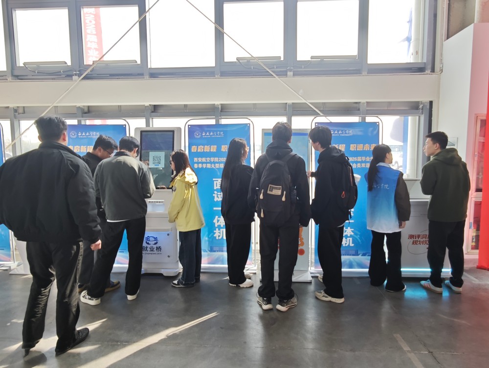 在双选会现场,“AI赋能就业体验区”因其创新性设置而备受瞩目。就业桥平台部署了四类智能化终端设备:人工智能面试屏、简历打印一体机、生涯探索一体机以及就业服务一体机,通过将人工智能技术深度整合至求职全流程,实现了就业服务的智能化升级。西安航空学院领导亲临展区视察指导,详细了解了各类智能终端设备的运行情况,对人工智能技术赋能就业服务的创新实践给予了高度评价,并与在场师生就数字化求职体验进行了深入交流。