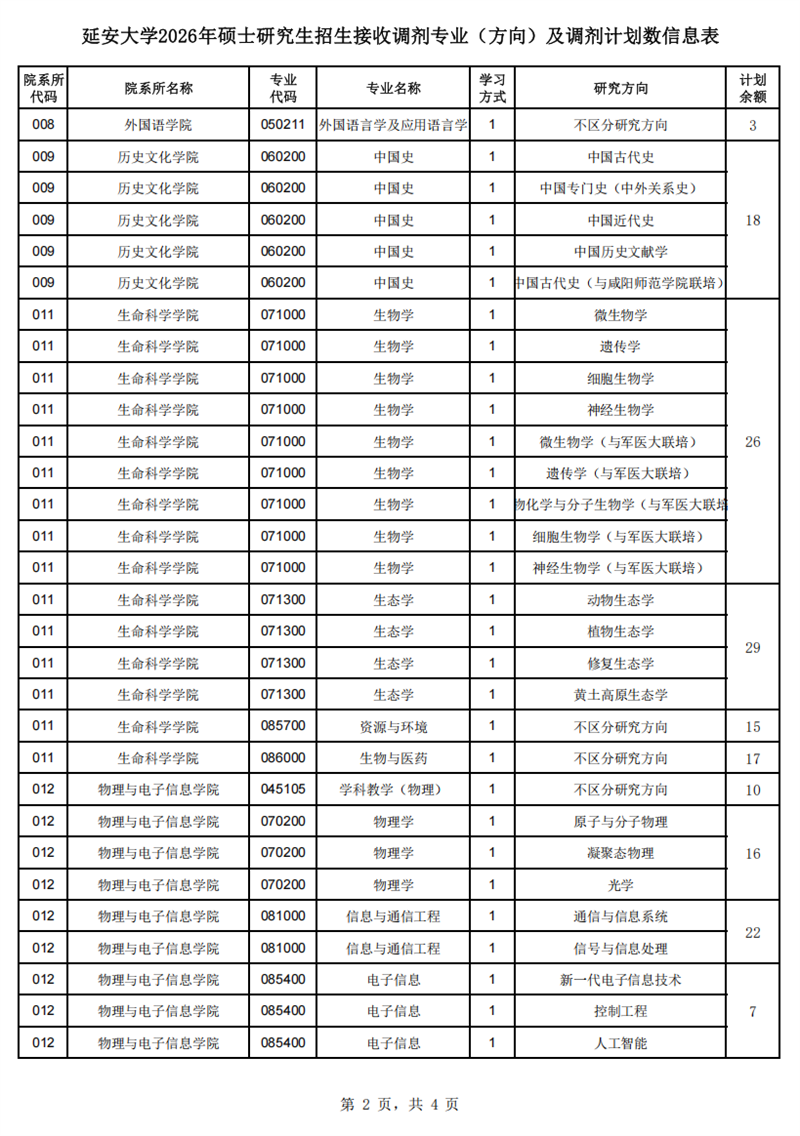根据延安大学2026年硕士研究生招生一志愿拟录取情况,结合招生实际需求,延安大学部分招生专业(研究方向)将接收调剂考生,经研究制定本调剂办法,现将相关事项公告如下。