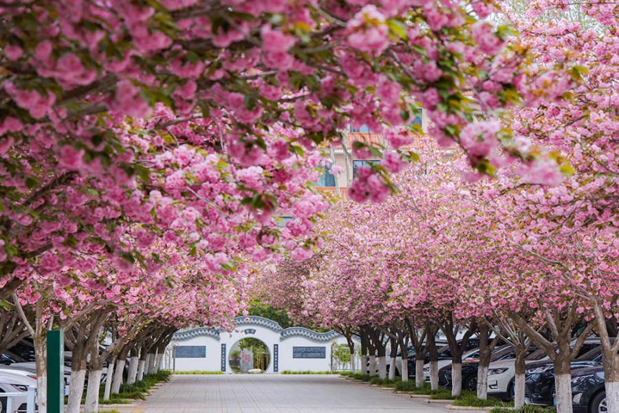 穿过智园的月亮门,花团锦簇。每一棵树上都挂满了精致的书签,“开花占得春光早,雪缀云装万萼轻”“梅花谢后樱花绽,浅浅匀红,试手天工……”书签上的唐诗宋词与枝头的粉白彼此增色。