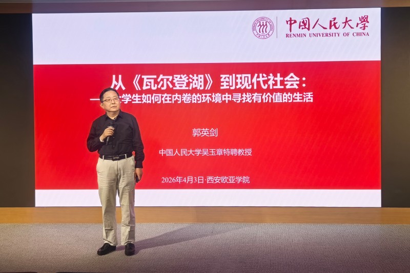 3个小时里,中国人民大学全民阅读教育研究院院长郭英剑教授为师生们带来《从〈瓦尔登湖〉到现代社会:大学生如何在内卷环境中寻找有价值的生活》的主题讲座,郭英剑、郑州大学外国语与国际关系学院院长高晓玲教授、西安欧亚学院回声学者童明教授三位嘉宾围绕经典阅读与人文教育的核心议题各抒己见、交锋碰撞,整场论坛话题从瓦尔登湖畔的小木屋延伸至当下的内卷与AI时代,从学者的个人阅读史探讨到经典的价值判断,几经转换却始终主线明晰:阅读从来不止是获取信息的工具,更是人们认知自我、理解世界、守护独立思考能力的根本方式。