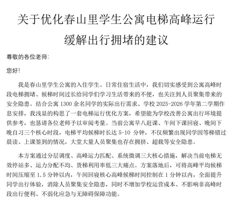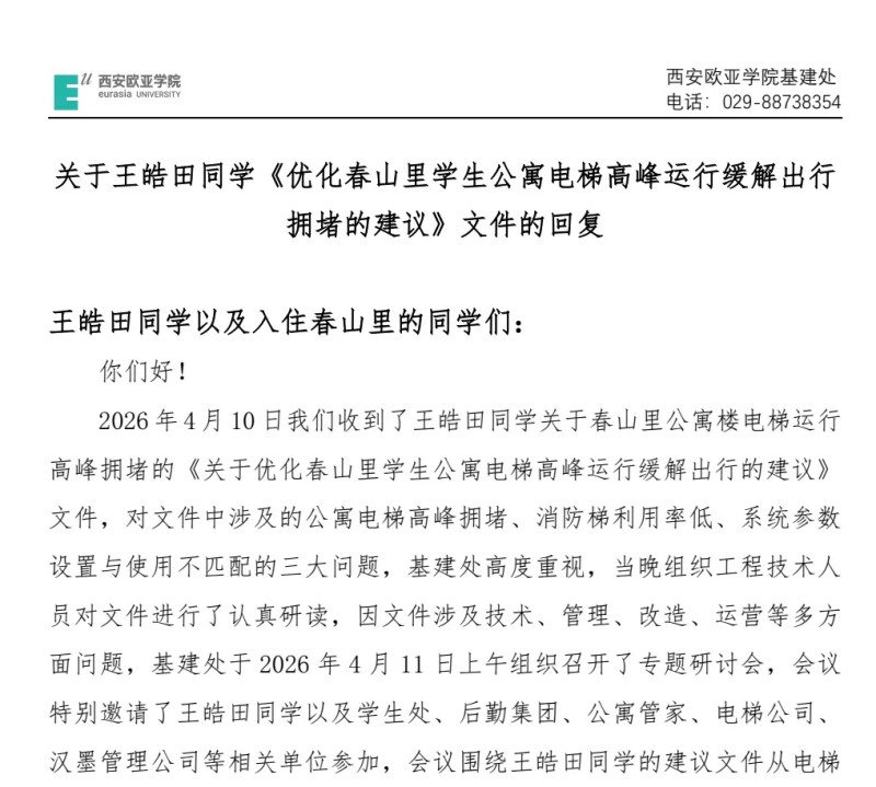 这样的日常体验,引发了一位大一学生的思考,也由此诞生了一份关于电梯运行优化的提案。4月上旬,这份《关于优化春山里学生公寓电梯高峰运行缓解出行拥堵的建议》提交后,学校在24小时内完成研读、研讨与反馈。这场被称为“欧亚速度”的响应背后,不只是效率的体现,也让一种围绕学生需求展开的校园治理方式逐渐清晰。