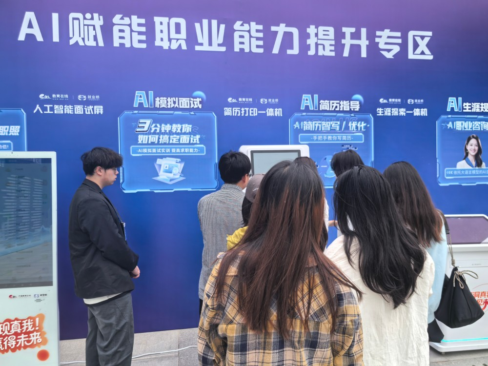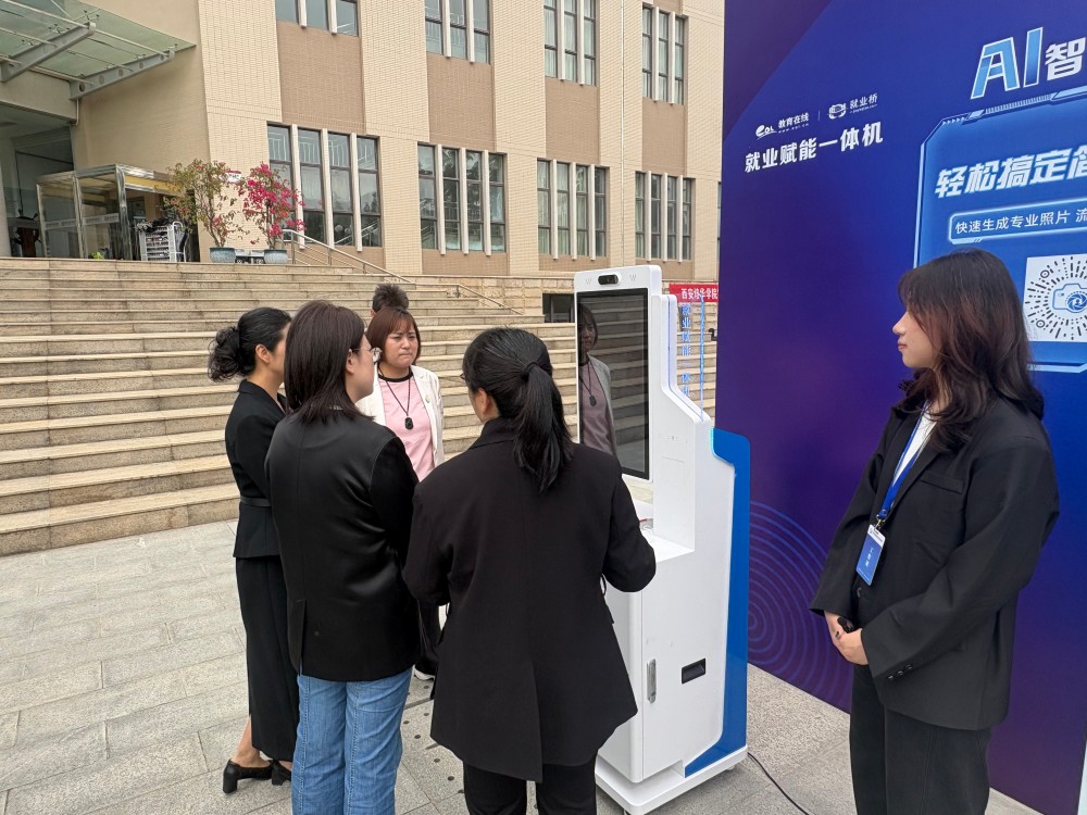 本次招聘会的亮点在于特别设置的“人工智能就业赋能专区”。该专区由就业桥提供技术支持,配置了五套智能化设备系统:人工智能面试屏、简历打印一体机、生涯探索一体机、就业服务一体机及就业赋能一体机。这些设备系统实现了从职业认知、简历优化、面试模拟到岗位匹配、就业管理的全流程智能化服务,吸引了大量学生参与体验。