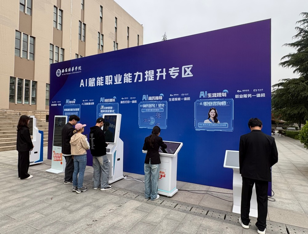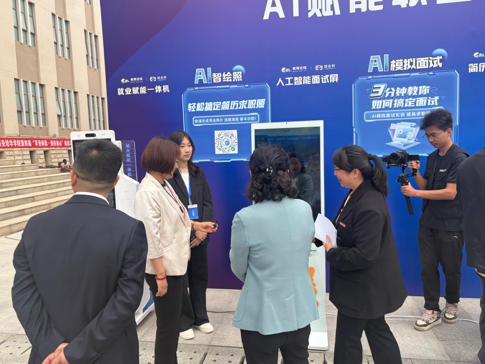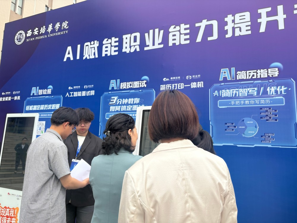 活动期间,西安培华学院领导一行到“人工智能就业赋能专区”实地参观了解。校领导听取工作人员对五台智能化设备功能介绍,观摩学生用设备进行简历生成和模拟面试操作。五套智能设备的协同应用,不仅为学生提供了贯穿求职全流程的人工智能赋能服务,更在实际应用中有效降低了求职准备成本,提升了就业效率。学生可在专区通过沉浸式体验,实现求职技能和心理素质的同步提升。
