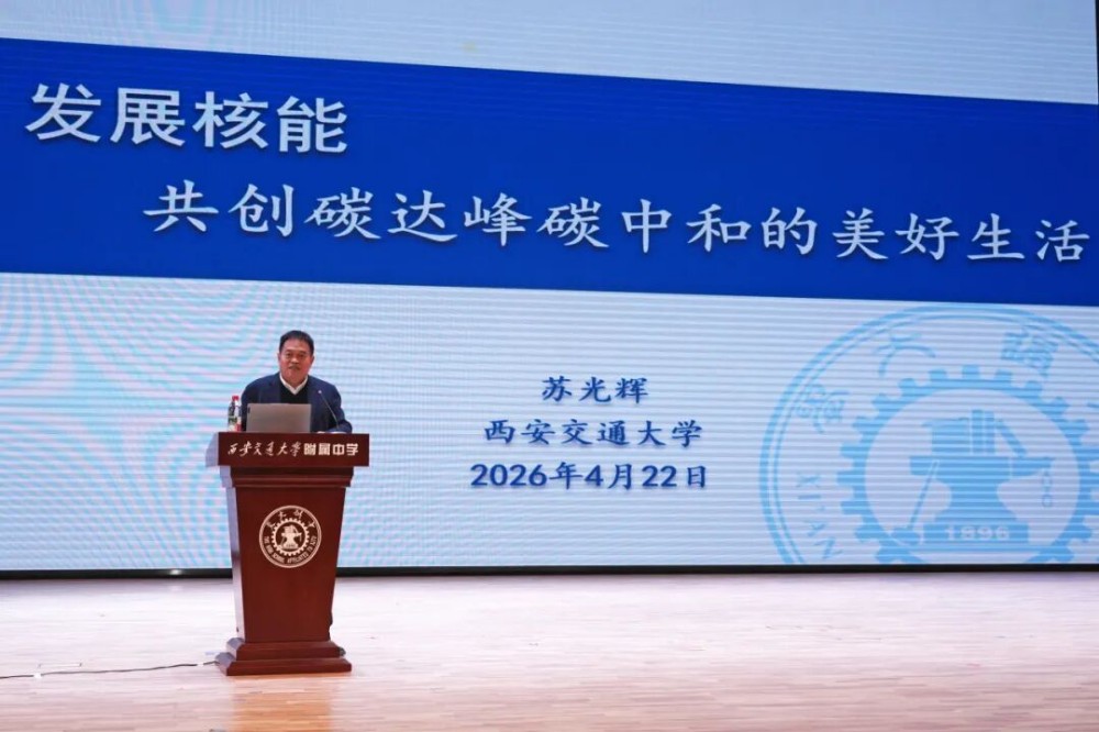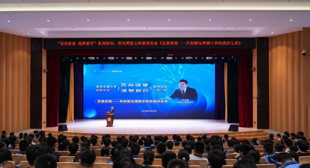 为弘扬科学家精神,厚植青少年科技报国情怀,助力“双碳”目标科普传播,2026年4月22日,中国工程院院士、西安交通大学能源与动力工程学院院长苏光辉教授应邀走进西安交大附中,做客“百卅讲堂 逐梦前行”系列活动,以《发展核能——共创碳达峰碳中和的美好生活》为题,为来自九个校区的师生带来一场兼具学术高度与育人温度的科普盛宴。本次活动由訾艳阳校长主持。