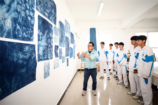 此外,学生们还以“被光照亮的那一刻”为题,用故乡落叶与校园植物进行蓝晒。“工作坊最珍贵的馈赠,或许不是某幅具体的画作,而是让学生们体验了‘通过创造与自己相遇’的过程。”王波表示,这次工作坊只是一个开端,希望家乡能有更多学生参与进来,完成一次次更深层次的探索。
