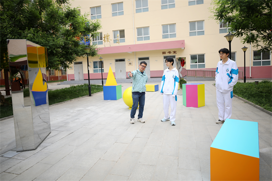 王波为学校创作的公共装置《诗意生长》同步落成于新馆前,作品以圆、方、三角为基本语言,镜面立柱映射穿行其间的人。诗句镂刻于亚克力色块上,部分选自描写西安的唐诗,部分来自学生创作。学生作品作为“插片”可定期更换,每年新增一届。“年复一年,这片诗意森林不断生长,成为一届届学生留下的精神年轮。”王波说。