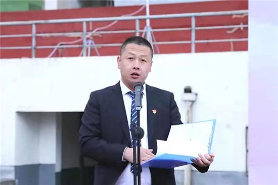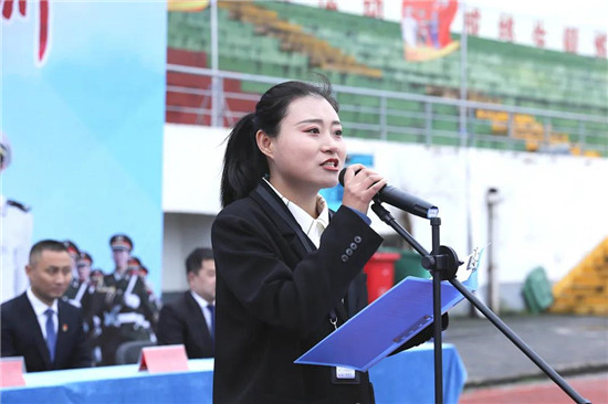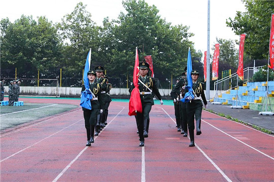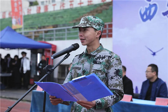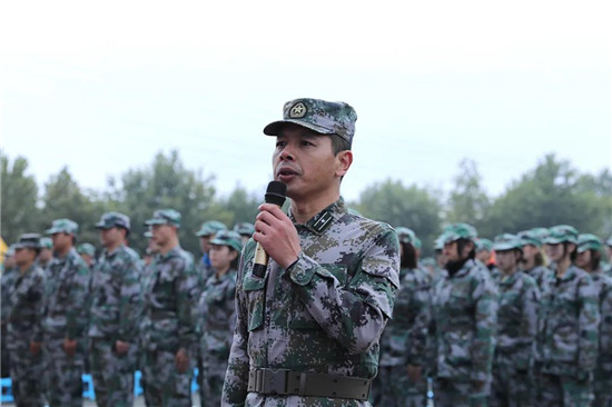 新生代表庄严宣誓,表示在军训中绝不退却、听从指挥,苦练基本功、磨砺意志,努力塑造优良品格,为今后的学习和生活打下良好的基础。