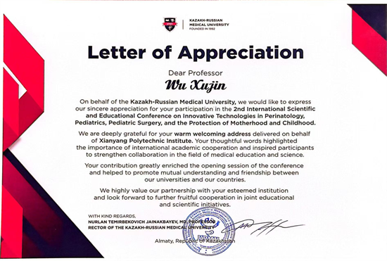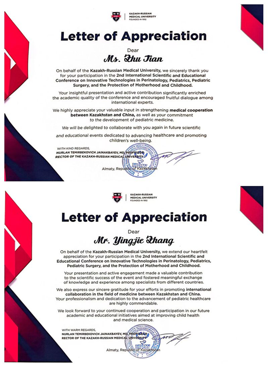 会后,哈萨克斯坦—俄罗斯医科大学校长努尔兰・特米尔别科维奇・贾伊纳克巴耶夫亲自签发感谢信,对学院领导的支持、两位老师的学术贡献致以诚挚谢意。信中指出,吴旭锦教授的致辞体现了学院对会议的高度重视,为两校深入合作以及中哈医学协作注入了强劲动力;朱添、张英杰老师的报告为多国专家搭建了知识经验交流桥梁,其在促进中哈医学国际合作、推动儿科医疗进步方面的努力“值得高度赞扬”。