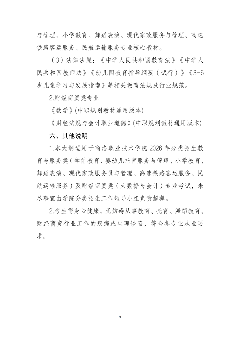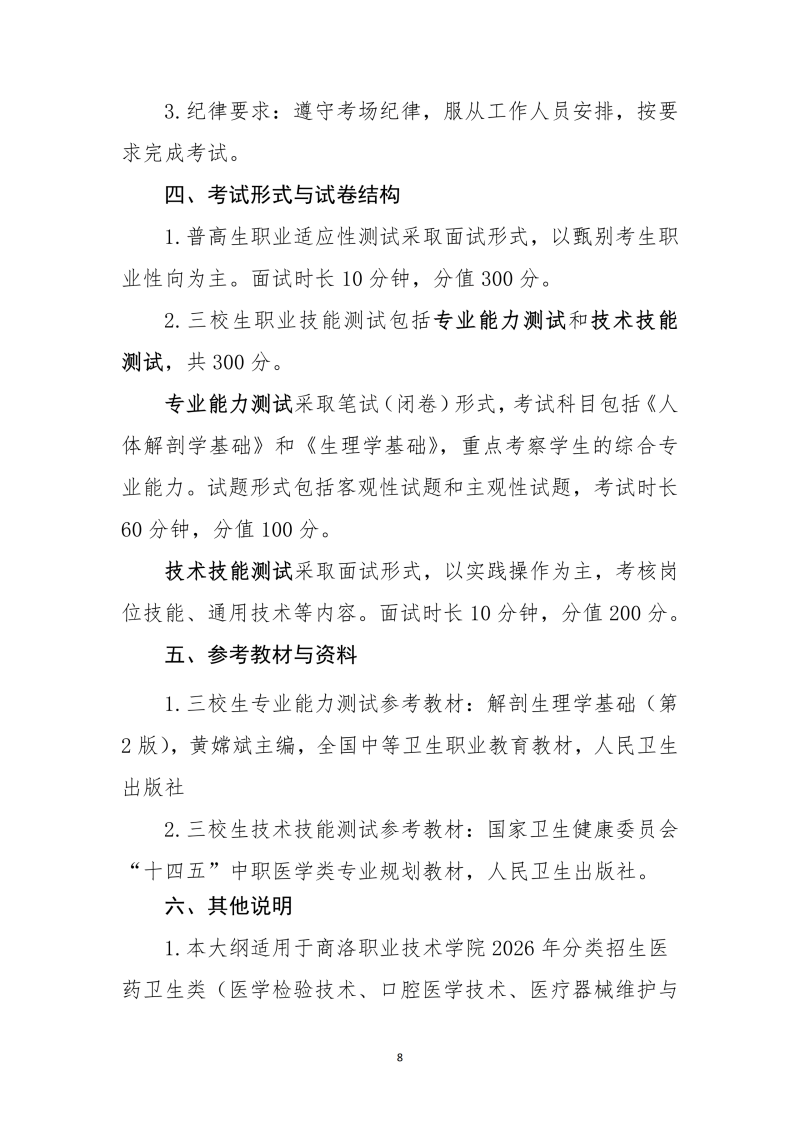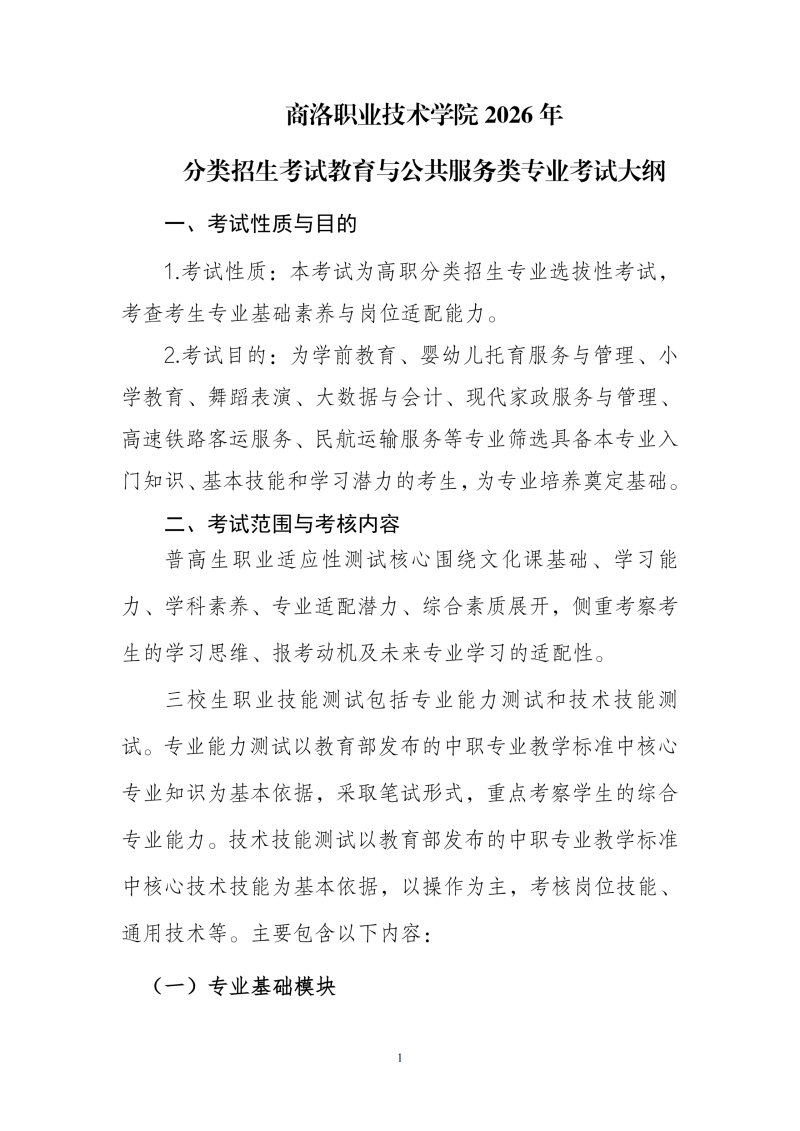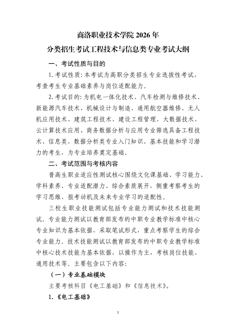 为贯彻落实国务院《关于深化考试招生制度改革的实施意见》,加快推进高职院校分类考试,深化高职院校单独招生改革,促进我省高等职业教育考试招生制度的逐步建立和完善,提升高职院校生源质量和办学水平,根据教育部有关文件精神,结合我院分类招生工作安排及招生章程,特制订《2026年商洛职业技术学院分类招生各专业考核大纲》。