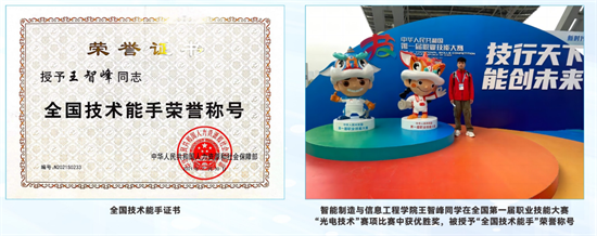 学校学生王智峰获“全国技术能手”称号