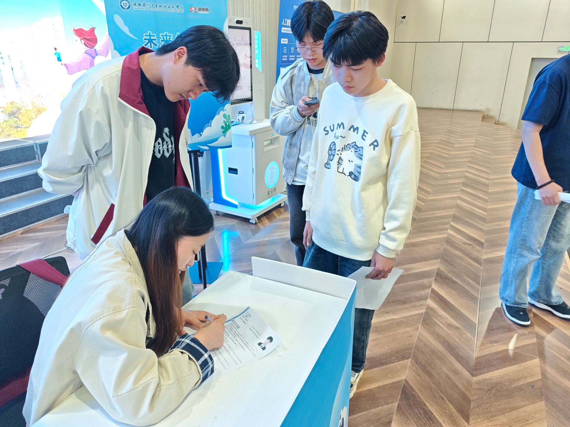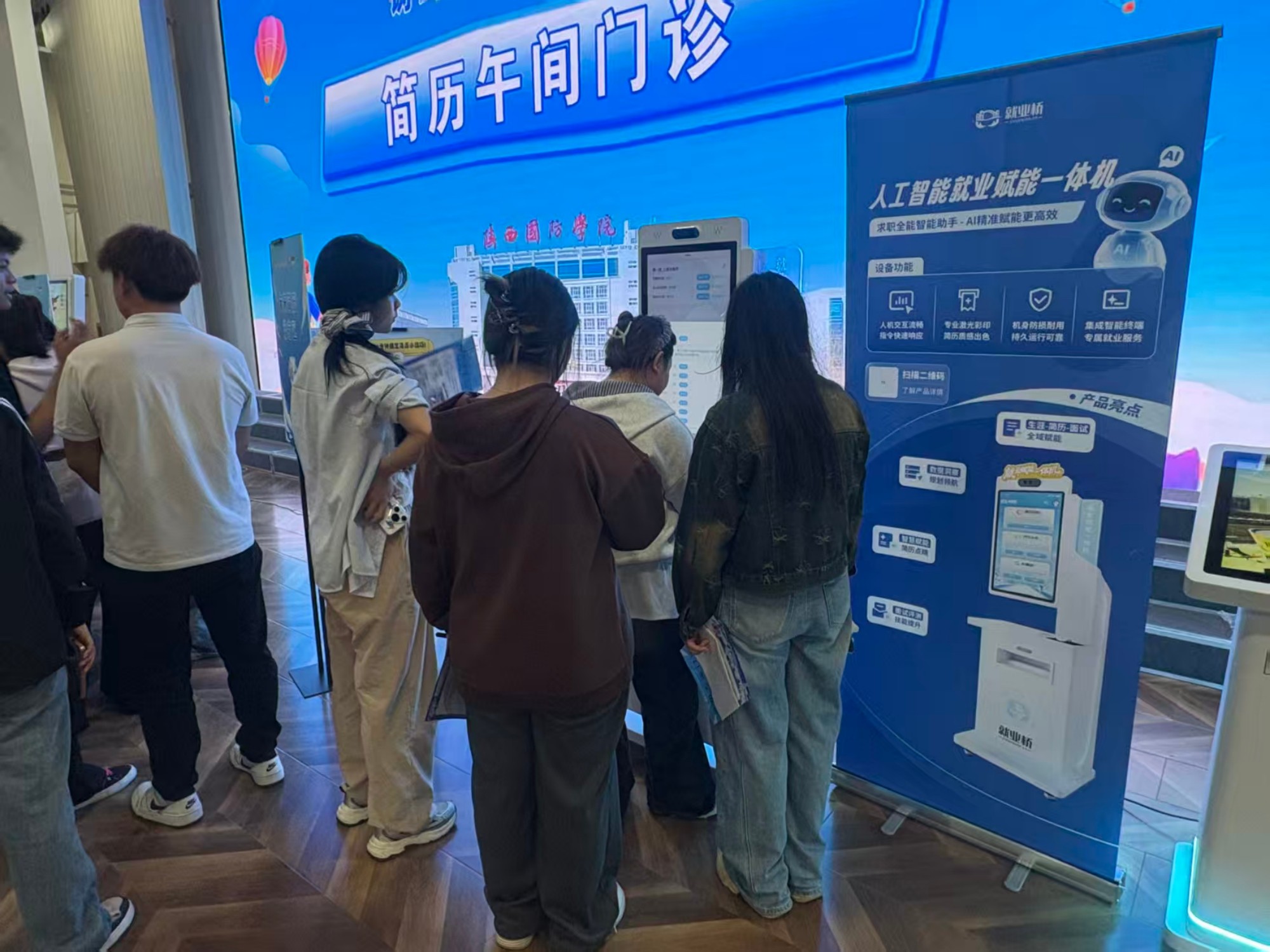 作为本次活动的一大亮点,现场特别设置了“AI就业赋能体验区”,五台人工智能就业服务设备同步开放,涵盖职业测评、简历优化、模拟面试、岗位匹配等多个功能模块,吸引众多学生排队体验。