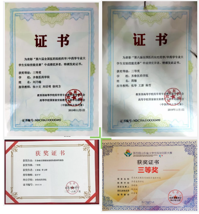 药学院始终秉承“以服务为宗旨、以就业为导向、以药学专业认证指标为标准”的原则,加强专业建设,提高教学质量。近年来学生累计获得各级各类比赛获团体奖17项,个人奖144项,药学院蒲公英志愿者服务队被评为山东省优秀服务队;药学院科技创新社团被授予“山东省优秀大学生科技社团”荣誉称号;学生获省优秀学士学位论文9篇,校级优秀学士学位论文76篇;国家级大学生创新创业训练计划项目立项78项;获山东省科技创新大赛三等奖4项;2017年、2019年连续2次参加全国医药院校药学/中药学专业大学生实验技能竞赛,获一等奖1项,二等奖1项,三等奖2项。