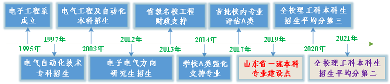 2019年获批山东省一流本科专业建设点。2003年开始本科招生,2012年开始招收电子电气方向研究生,2013年获批山东省省级名校工程财政支持专业,2014年获批学校A类强化支持专业,2017年获首批校内专业评估A类强化支持专业。