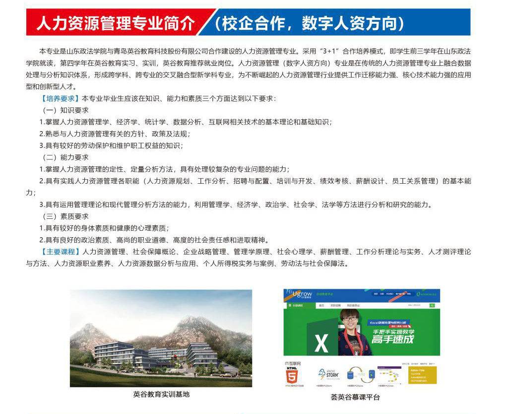 人力资源管理专业(数字人资方向)培养适应国家政策引导和产业数字化转型升级需要的德、智、体、美、劳全面发展,具有现代人力资源管理基础理论知识,基本的数字化人力资源基础理论;具备开发与管理人力资源的实际操作技能;具备现代数字化管理理念和良好的职业道德,能在政府机构、中小型工商企业以及事业单位从事人力资源管理、企业管理、行政管理等方面工作的中级以上高素质技术人才。
