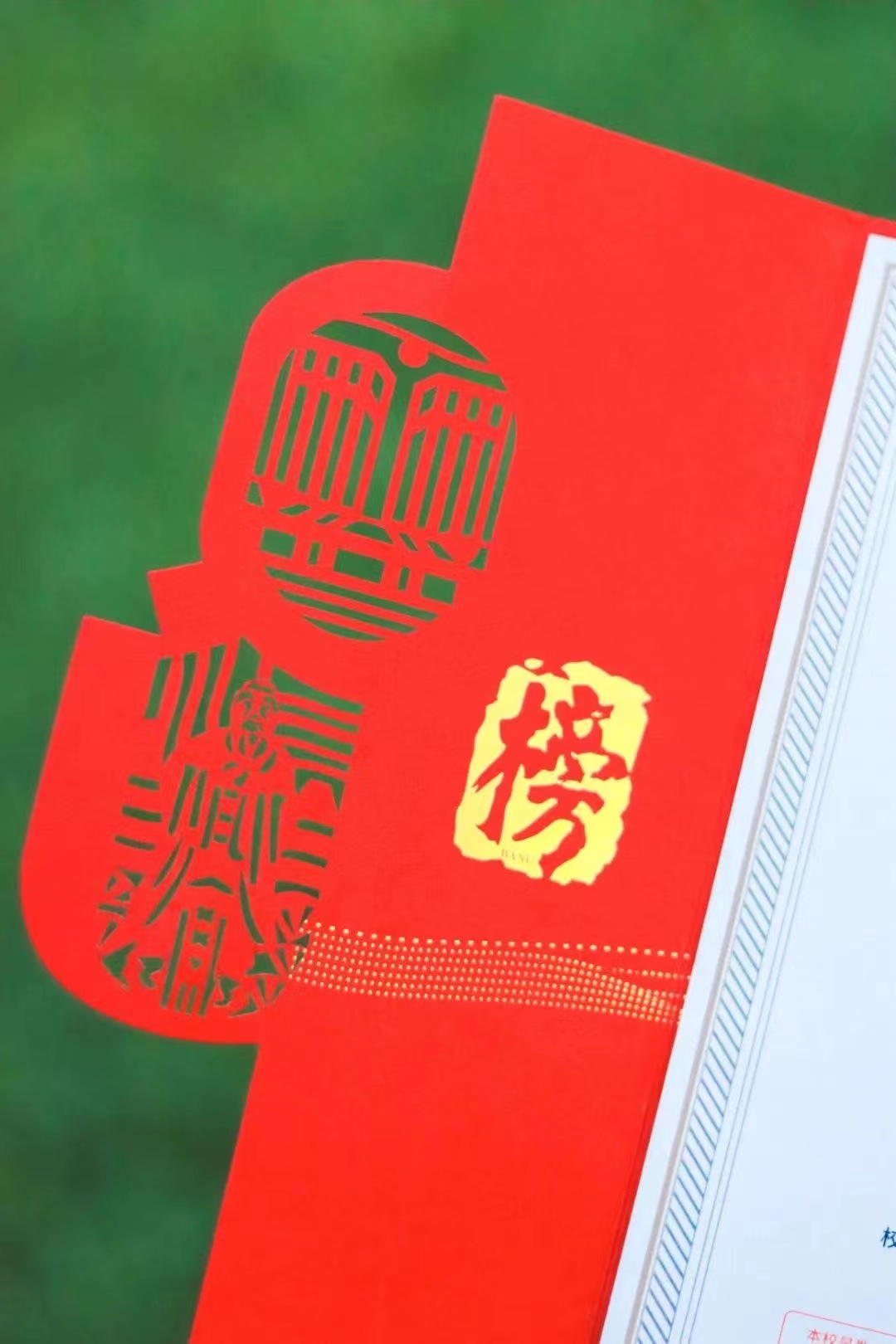 镂空图形中,双子楼上,旭日东升;孔子像前,松柏长青。寓意坚忍不拔的青大精神和澎湃向远的时代新篇。“榜”的印章设计,流动的学海图形。海天相接,恭贺金榜题名,山海之间,任你驰骋与翱翔。