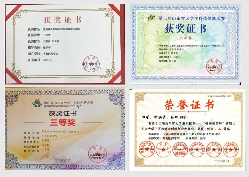 近年来,学生累计获得各级各类比赛获团体奖20项,个人奖173项,药学院蒲公英志愿者服务队被评为山东省优秀服务队;药学院科技创新社团被授予“山东省优秀大学生科技社团”荣誉称号;学生获省优秀学士学位论文9篇,校级优秀学士学位论文97篇;国家级大学生创新创业训练计划项目立项78项;获山东省科技创新大赛三等奖4项;2017年、2019年连续2次参加全国医药院校药学/中药学专业大学生实验技能竞赛,获一等奖1项,二等奖1项,三等奖2项。