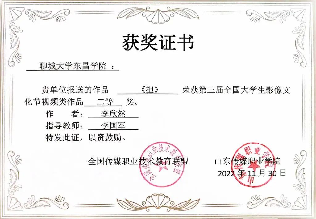 其中,影视传媒系学子在视频类版块中共获得二等奖一项、三等奖两项、优秀奖三项:作品《担》获得二等奖;作品《黄河边的坚守》《黄河边的铜匠》荣获三等奖;作品《柠檬如饴》《东昌古锦》《飞跃古城》均荣获优秀奖。在图片类版块中,共获得三等奖和优秀奖各一项:作品《黄河印象》荣获三等奖;作品《标准》荣获优秀奖。