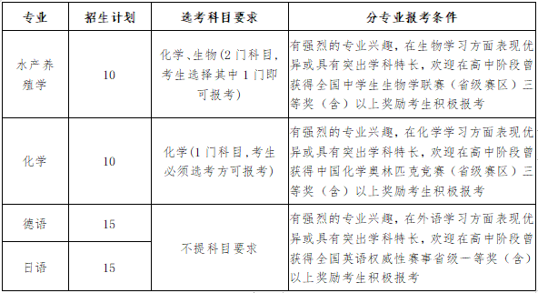 招生专业包括:水产养殖学、化学、德语、日语,计划招生总人数:50人。考生需同时符合以下报考条件: